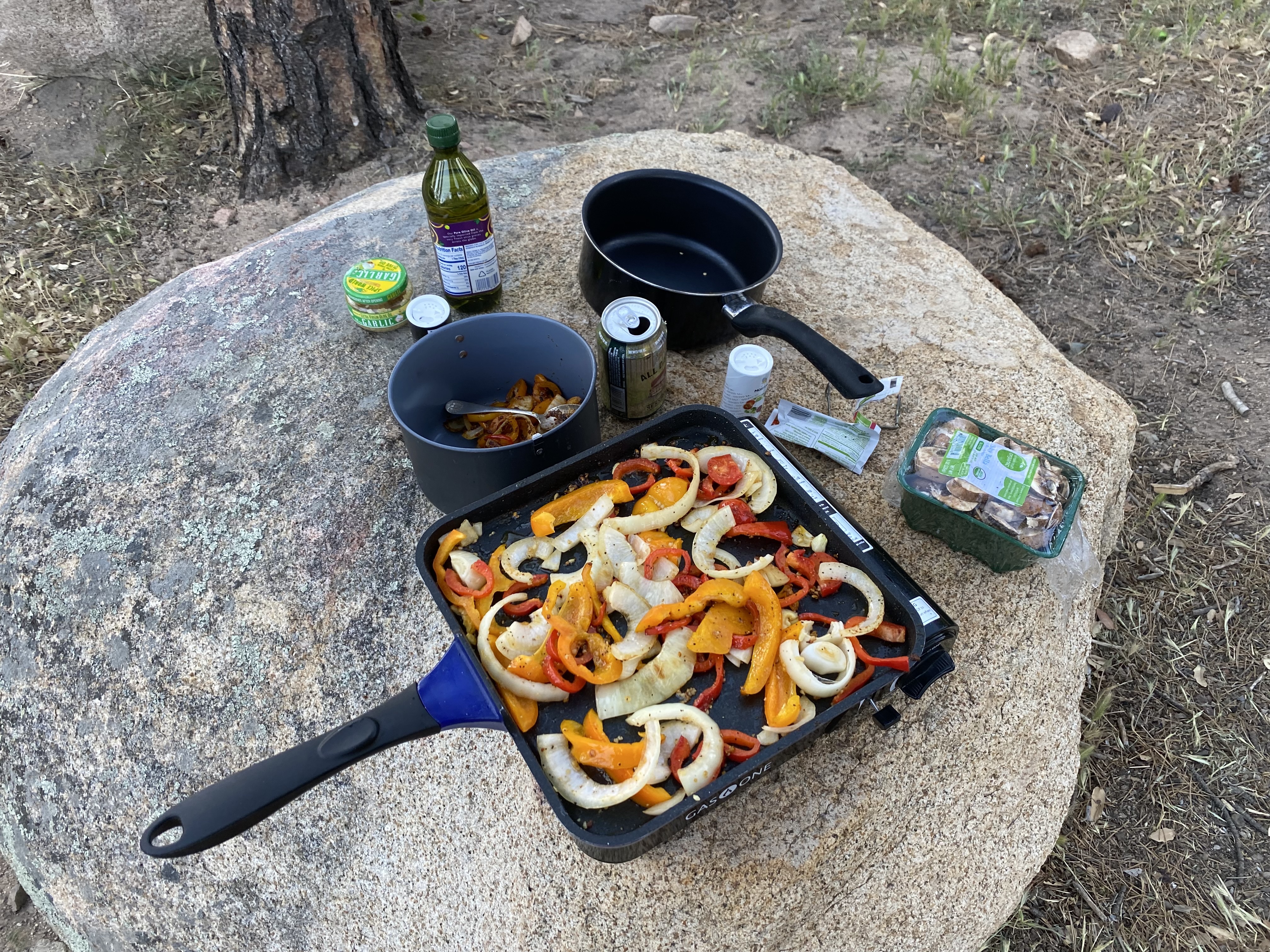 After our naps, we headed out for a hike around the area. We ended up making a loop of about 3 miles, and that was very pleasant. When we got back to camp, it was time to cook up some dinner. Dinner was fajitas, so we sliced up the peppers and onions, and I grilled those up with some taco spices (along with some mushrooms), and Jack cooked up some rice. We mixed a can of beans in with the rice and had an excellent meal.