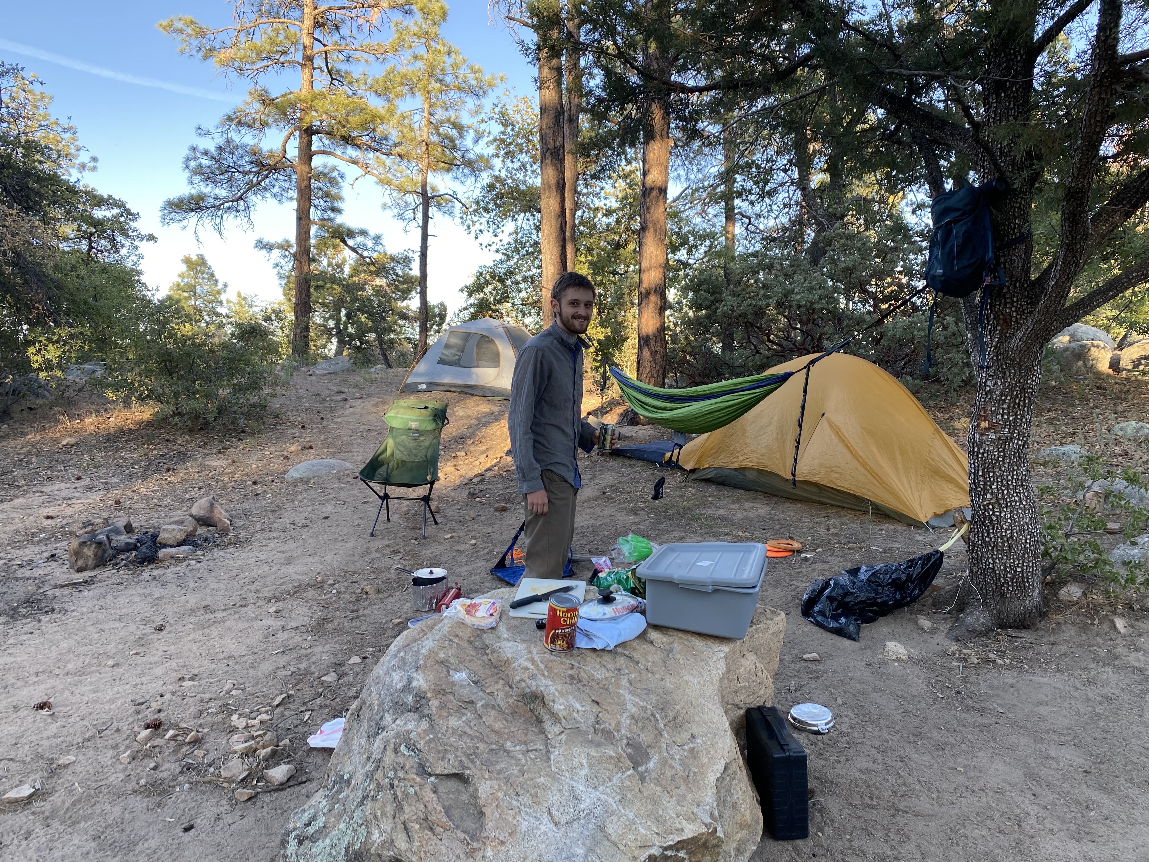 We then headed out Thumb Butte road to find a campsite for the next couple of days. The road is rather un-improved, but it was passable with my car. We did go forward at just barely a crawl, though. There were plenty of these campsites out here in the Wildland Urban Interface (WUI) area we were in, so we picked one and started setting up camp. While we were setting up camp, the ranger came by and gave us some info (mostly that the fire risk is high, and the only fires that are allowed) have an on \ off switch (like a camp stove). After camp was set up, Jack made us some sandwiches for lunch. After lunch, it was getting pretty hot, so we decided to lay down and take naps for a bit until it cooled off.