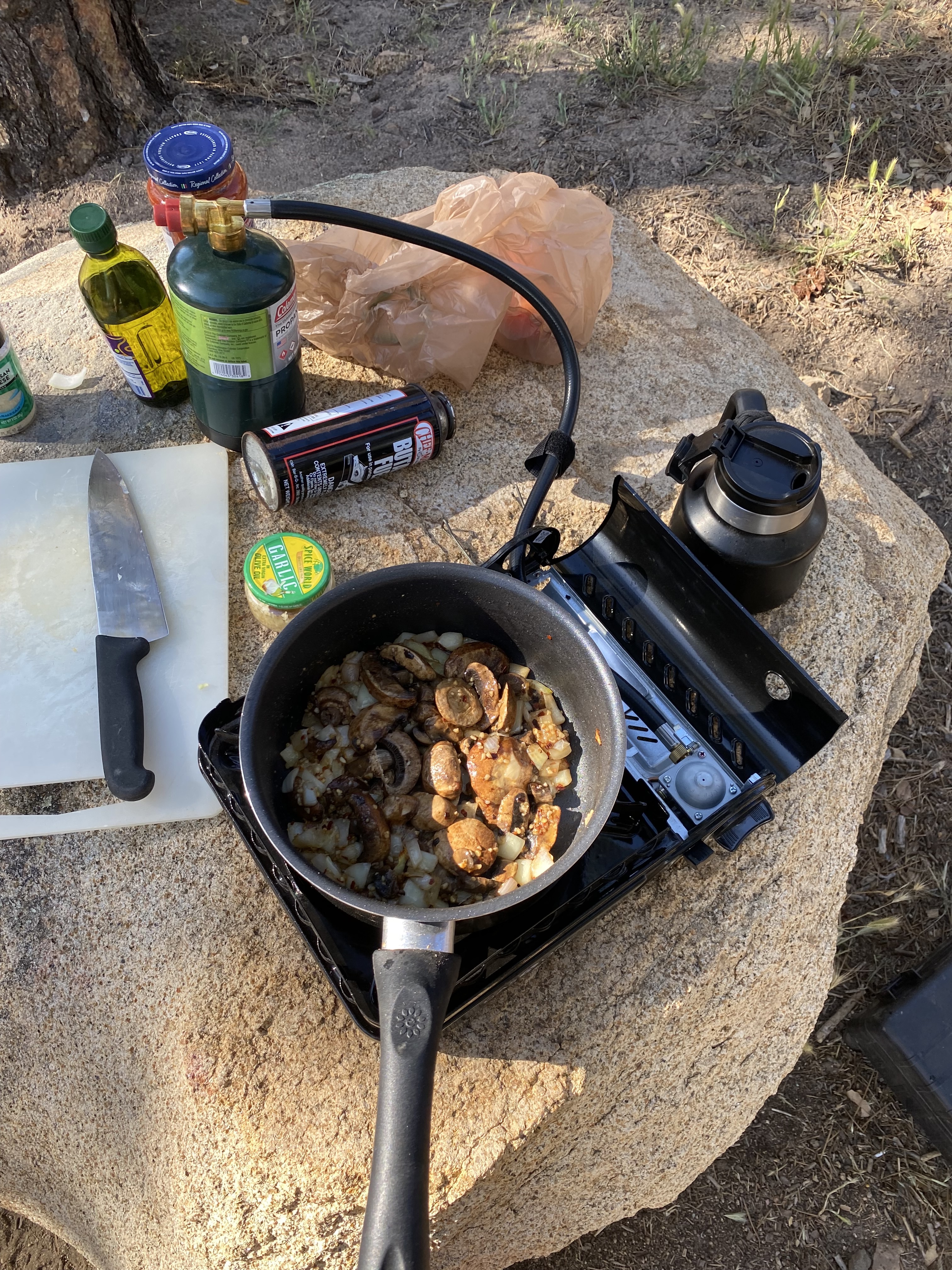 We doctored up some spaghetti sauce for dinner by frying up some onions, garlic, mushrooms, and tomatoes in olive oil, and then adding in a jar of store-bought marinara sauce. Jack boiled up some penne pasta on his stove, and then we combined them and chowed down. It was pretty yummy. Then it was back to more chatting. Before sunset, we cleaned up the cooking area before it got too dark and then chatted some more.