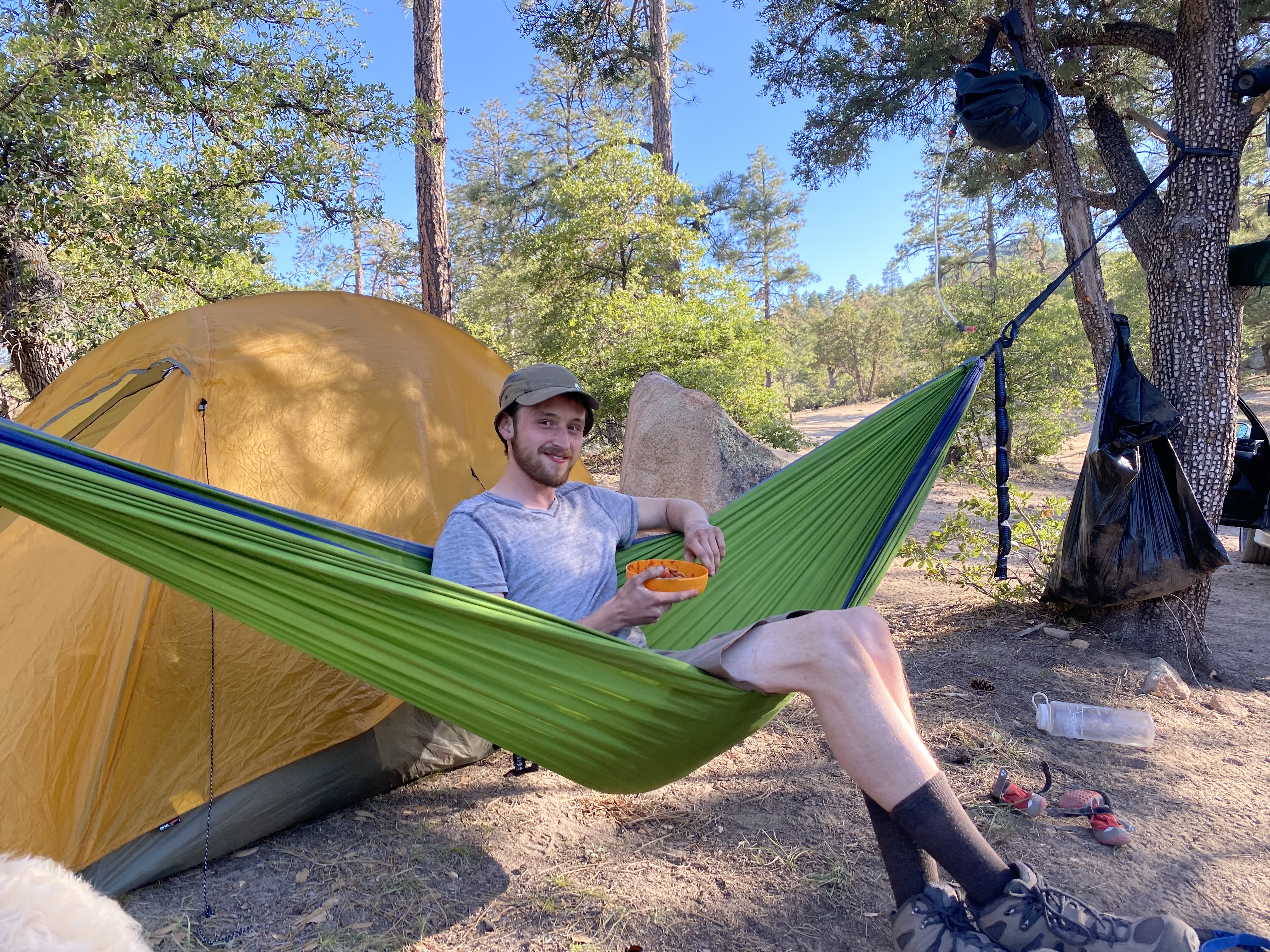 Things are good here. Yesterday Jack and I got up, made out coffee, and headed out for a nice long hike early enough that we would be able to get back to camp before it was too hot. The hike was just under 7 miles and was a loop that went over to thumb butte, up it, and then back. We could not scramble up to the very top of the butte, as it was closed for peregrine breeding. Penny was fantastic on this walk. Not quite as much running back and forth, but more run to the next shady spot and wait.